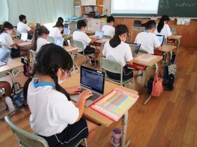 お隣の2組では、国語のローマ字の学習を活かして、タブレットのローマ字入力の練習。ホームポジションを確認し両手でできるとカッコイイ