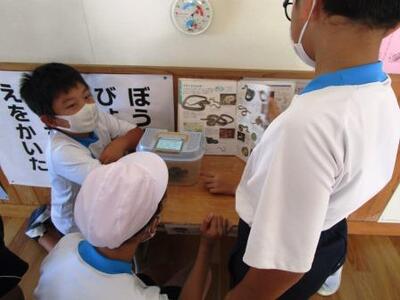 飼育ケースに入れて図鑑と一緒に…シマヘビの仲間、カラスヘビのようです。みんな興味津々!「かわいい!」「飼いたい!」「うちにはもっと大きいのがいる。」などと賑わっていました。放課後、逃がしてやります