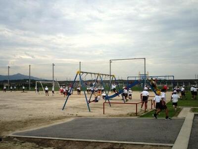雨が上がった運動場で今日は3年生がかけっこをしていました。運動会では去年までより20M長い100Mを走ります