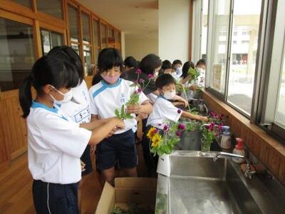 多くの学級がもらいに来ました。「わあ、きれい!どんな風に生けようかな?」