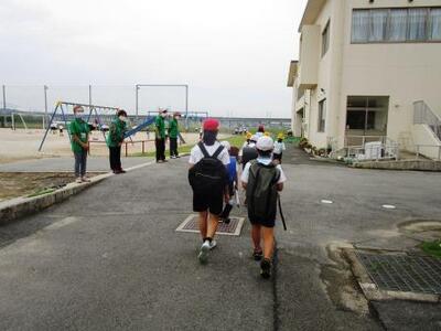 班長さんを先頭に右端を安全に歩いています。エライ!