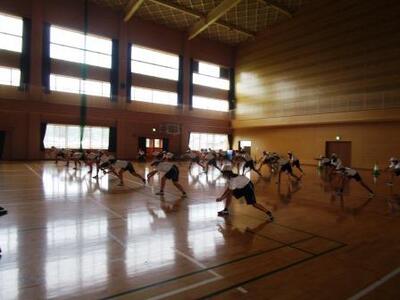 体育館では1年生がラジオ体操の練習。伸ばしたり曲げたりするポイントを一つ一つ覚えていました。運動会ではカッコイイ準備運動をみせてね
