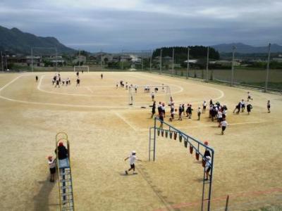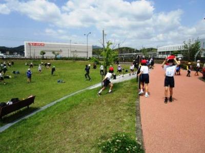 2年生は合同体育。広い運動場で思い切り体を動かして