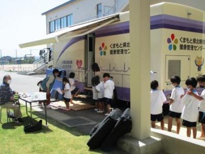 中1、小4、小1は、心電図の検査がありました。真新しいくまもと県北病院の検診車で順番に受けていました。