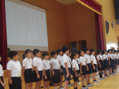 「ひびきあい集会」は、各学年、朝の会で練習した「今月の詩」を発表することで、表現力や言語活動の基礎を養うことを目的で実施しています。内容は玉名で作られた教材 玉名学 「日本語」からの発表です。今月は、2年生と5年生の発表でした。暗唱した詩を、工夫して表現し、聞く人の心に残る発表をしてくれました。