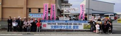 受賞に伴い、地元ひまわりテレビが取材に来られました。今朝のあいさつ運動の様子も撮影していただいています。ありがとうございます