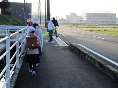 県北くまもと病院横を通って登校する班の安全見守りには、毎朝、地域の皆様に大変お世話になっています。おかげで、子供たちも車に気をつけ、歩道内の内側一列歩行が上手になってきました。