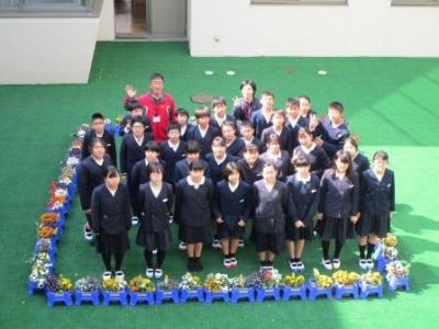 1年生が一人一鉢ずつ育てた植木鉢の花がきれいに咲きそろいました。先週ベランダから中庭にお引っ越し…みんなの目を楽しませています。今日は6年生に花の中に入ってもらい、2階から写真を撮りました。1年生がお世話したかわいい花に囲まれ、6年生もかわいい笑顔になりました卒業式も花いっぱいの中実施できそうです。1年生、ありがとう