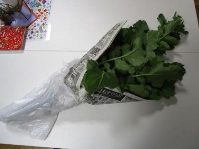 スマイル農園ですくすく育った大根をプレゼントしてもらいました。花束のようにくるんで大事に持ってきてくれて…見ると本当にかわいい大根の花がついていました新鮮でおいしそう!早速、今晩、おでんにしていただこうと思います。農園を作ってくださった学校運営協議会の皆様に、一生懸命に作物のお世話をしたお友達に感謝していただきます