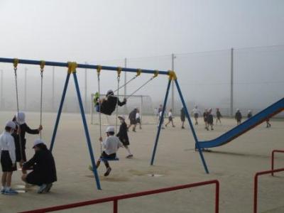 今日は朝靄が濃かったですね。朝の冷え込みもなくなり、気持ちのよい朝でした。子供たちは登校後、元気に運動場へ出てきていました。