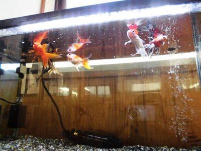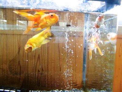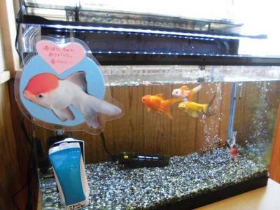 暖房が入る教室と違って廊下は冷蔵庫のように冷えていますが、金魚さんの水槽は保温装置がついていて水温25℃が保たれています。5匹はとっても元気に泳ぎ回っています
