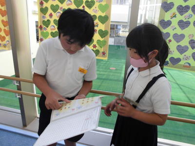 毎日、昼休み頃昇降口前の階段付近が賑やかです。それは…2年生の九九覚えを上級生が聞いてやっているのです合格したらシールをもらって…自分たちも通った道、応援する気持ちもひとしおのようです。私もその昔、7の段で苦労したのを思い出しました