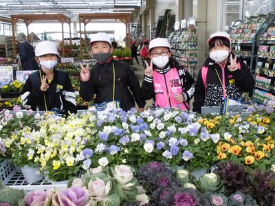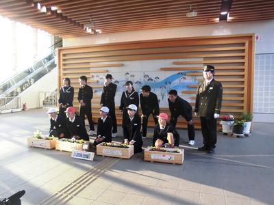 このたび、玉陵小中学校と学校運営協議会がタイアップし、「花でおもてなしフラワープロジェクト」を計画しました。自分たちで植え育てた花のプランターを新玉名駅の駅舎内に設置してもらい、お客様をおもてなししようという地域貢献活動の一環です。今朝、中学校のフラワーボランティアの日に合わせて小学校から環境委員さんの代表が参加し、プランターにパンジー・アリッサムを心を込めて植え付けました