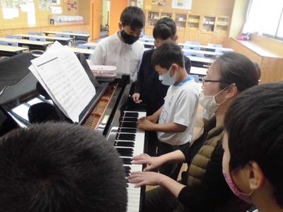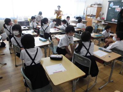 玉名市音楽アウトリーチ事業を利用させていただき、「リヴィエール」の4名の皆様をお招きしてスクールコンサートを実施しました。楽器はピアノに加えてパーカッション、チェロ、コントラバス。クラッシックのカノンや白鳥、アニメのトトロや魔女の宅急便の曲、最後には本校の校歌も演奏していただき大喜びの子供たちでした途中の楽器紹介では、マーチングの実演やコントラバスを弓で弾かせてもらったりと、密度の濃い時間になりました。感染症拡大防止のために3・4時間目に分けての実施でしたが、あっという間の楽しいひとときでした
