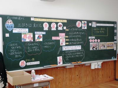 昨日、2の1で道徳の研究授業が行われました。講師の先生をお招きし全職員が研究会に参加する大研です。教材名は「三びきは友だち」内容項目は「公正、公平、社会正義」です。主題は「えこひいきしないで」~つまり、人によって態度を変えないことについての学習でした。分かっていても、大人でも難しい行動ですよね。2年生は「人によってたいどをかえないことのよさを考えよう」のめあてに沿って、登場人物の3匹の行動や心情について深く考えました。最後は「人によって態度を変えないと、すっきりするしみんなと仲良くできる」という考えに行き着き、自分を振り返って感想を持つことができました。講師の県立教育センター指導主事の先生から「先生も子供たちも道徳の勉強が大好きなことがよく分かる。未来志向の素晴らしい授業!研究会もとても充実している。」とお褒めの言葉をいただきました