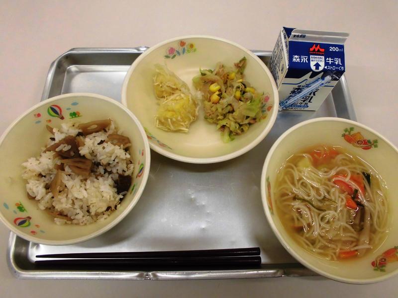 給食では毎月1回、日本各地の名物料理が食べられる「味の旅」があります。今日は「佐賀」の味。献立は「レンコンの混ぜ飯・そうめん汁・イカシュウマイ・玉ねぎのサラダ」…レンコンの混ぜ飯は初めていただきましたが、しゃきしゃきした歯触りがとても良くておいしかったです玉ねぎのサラダも全く辛みなくさわやかな味でした。佐賀を旅した気分に浸りました