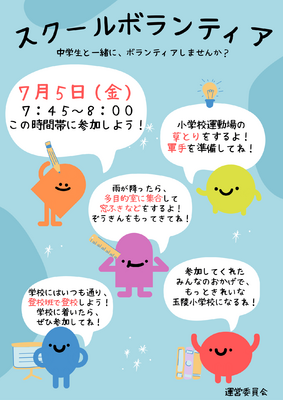 運営委員会の企画で「中学生と一緒にボランティアしませんか?」の取り組みが実施されました。この取り組みは、中学校の取り組みにあわせて、小学校の運営委員会がよびかけにより行われました。7時45分から8時までの間の取り組みです。第一回目は、178名もの子ども達が参加しました。校庭や花壇、県北病院の花壇がきれいになりました。