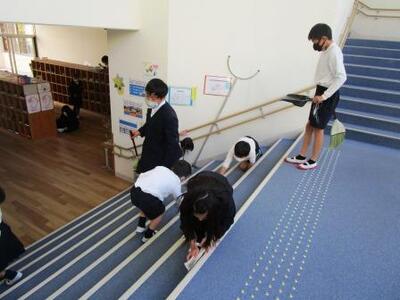5年生と2年生が力を合わせて中央階段をきれいにしていました。学校もきっと喜んでいますよ。