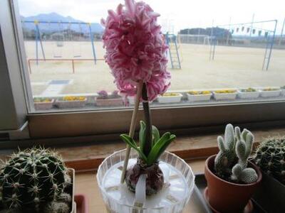 この前紹介したヒアシンスにつっかえ棒が!しゃんと背中が伸びていました。ほっこりします
