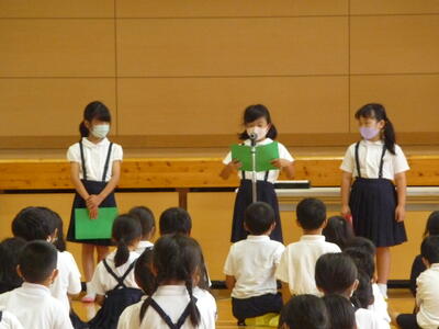10月7日(金)、今日の5時間目に「前期終業式」を行いました。校長先生の話の後、2,3,4年生代表児童の発表があり、校歌を斉唱しました。児童の発表では、前期に頑張ったことと、後期のめあてについてしっかりと伝えてくれました。