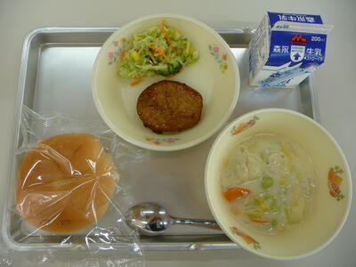※今日の給食メニュー・・・まるパンカット、白菜の米粉シチュー、チキンの照り焼きパティ、コールスローサラダ