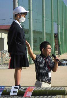 外で健康観察後に開始!まず、実物の竹(松川会長さんに頼み小田から切って持参いただきました)を見せて「節目の大切さ…一年間の節目に当たる今日、後期の目標をしっかり決め目標達成に向け努力する後期102日にしてほしいこと」次に「10倍上手になったあいさつをさらに100倍よくするために、あいさつ名人班を見習い、自分から元気に笑顔のあいさつをしてほしいこと」最後に「(前期の反省から)背中ピン・足裏ベタ・ジーッと見て話を聴き、ハイ!と返事・発表をがんばりましょう!」と伝えました。秋晴れの青空の下、みんなよく話を聴くことができました