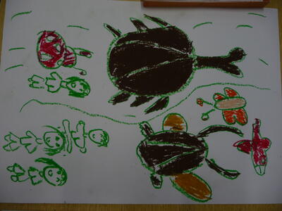 【自然の様子を絵に描こう(昆虫と遊んでいる絵) 1年1組・2組 図工】一人一人が思い思いに自分の好きな昆虫を描いていました。(作品はまだ途中の段階です)