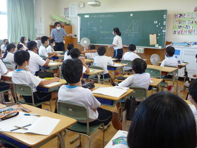 【壁の高さを求めよう・・・6年生 算数】6年生は、算数の時間に「縮尺」を利用して、校舎の高さを求めていました。実際に外に出て、分度器を使って測るなど実感を伴う学習が行われていました。