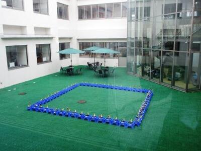 中庭に1年生のチューリップの鉢が並べられました。本物のカフェのようです