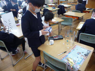 【光のプレゼント・・・2年生】2年生は図工の時間に、光を通す材料を集めて工作をしました。筒形の透明なものに、色セロファンなどを貼り、実際に光を通して映る形や色を楽しむものです。
