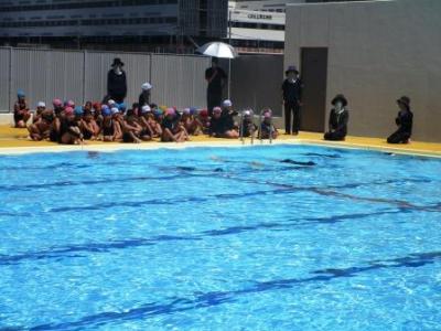 1年生は小プールや大プールの横をけのびで距離を測りました。みんな水となかよしになりました。