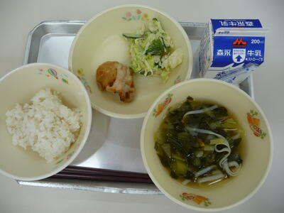 ※今日の給食メニュー・・・コーンとチンゲンサイのスープ、鶏肉のマーマレード焼き、ブロッコリーサラダ、麦ごはん、牛乳