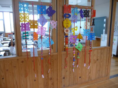 1年生の教室を通ると、このような素敵な飾り(作品)を見つけました。図工の時間に、折り紙を折って、はさみで切って作ったそうです。縦一列のつながりが、一人の作品です。廊下がパッと明るくなり、楽しい雰囲気を出しています。