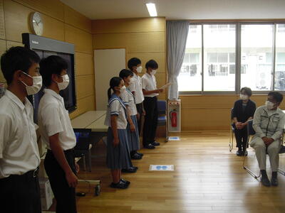 熱中症対策の一つとして、本校では「日よけ傘」を希望者には貸し出しています。今日の昼休みに、希望者を集めて配付しました。破損したり、けがの原因になったりしないように、教頭先生から注意がありました。