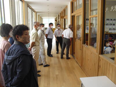 児童生徒を呼び出してもらうために並んでおられる保護者の方々。