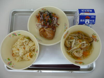 ※今日の給食メニュー・・・しょうがまぜごはん、ふしそうめん汁、とり肉のてりやき、ゆかり和え、牛乳