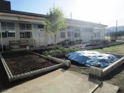理科園…堆肥入れ・耕しの後、ゴーヤ用の立派な棚を2つ立ててくださいました。今年も豊作でしょう!