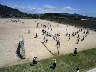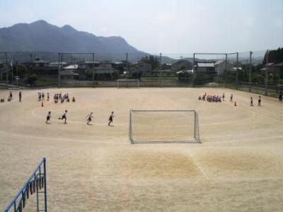 金栗タイム。今朝は中学校で陸上部の朝練があっていたので、全学年が小学校の運動場を走りました急ぎ