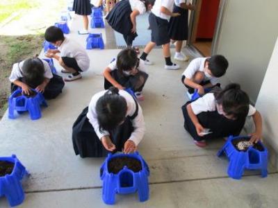 1年生が種まきした朝顔の芽が出そろいました。毎朝張り切って水掛をしています。