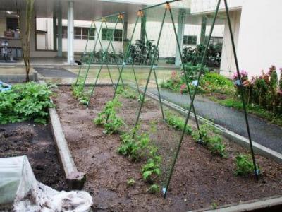 理科園には、早速ゴーヤ・ヘチマ用の支柱を組み立てていただいていました。