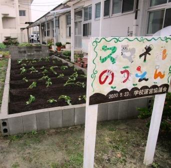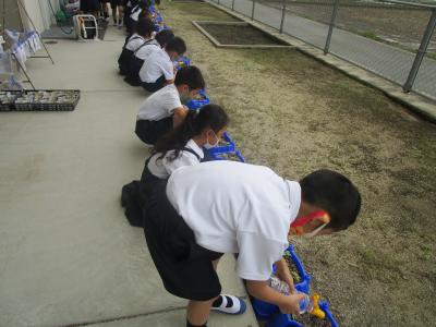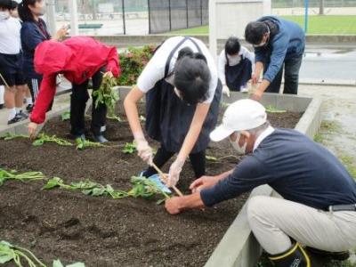 雨が小降りになった昼休み、松川さん・荒木さんにお世話いただき、スマイル農園でさつまいもの苗植えをしました。2回目ですのでなかなか慣れた手つきでした。