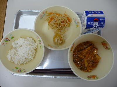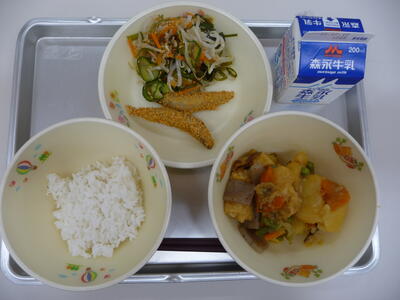 ※今日の給食メニュー・・・麦ごはん、じゃがいものカレーうま煮、きびなごかりかりあげ、
