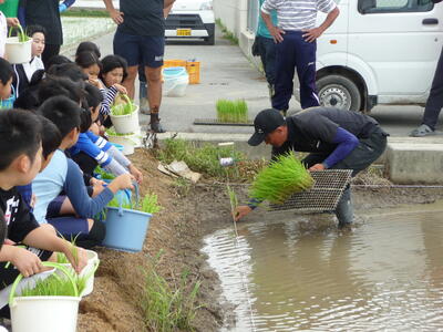 6月24日(金)、朝9時から5年生は学校プール南側(保護者所有の田んぼを貸していただいている)で、田植えをしました。保護者や学校運営協議会の方10名にも手伝っていただきました。初めて田んぼに入る児童も多かったようで、とてもよい経験をさせていただきました。5年生は、苗が生長していく様子を教室から見守りながら、秋の稲刈りを楽しみにすることと思います。