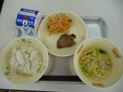 ※今日の給食メニュー・・・麦ごはん、野菜スープ、キャベツのメンチカツ、梅かつおあえ、牛乳(野菜スープはたくさんの種類の野菜が入っていて体によく美味しいスープでした)