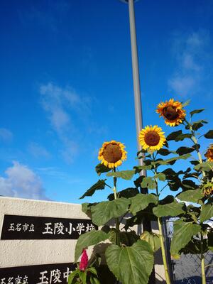 玉陵学園正門に花壇がありますが、今、大きな背の高い『ひまわり』が咲いています。夏の青空に似合う綺麗なひまわりです。