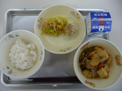 ※今日の給食メニュー・・・麦ごはん、ぐる煮、鶏の香り焼き、ゆずかつおあえ、牛乳