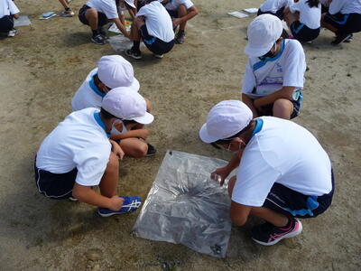 【雨水のゆくえ・・・4年2組 理科】理科の時間に、外に出て雨水が蒸発ことについて実験をしていました。