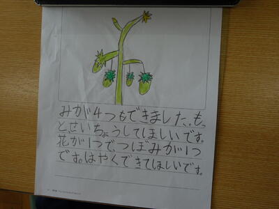 2年生は、5月、生活科の時間に「ミニトマト」の苗を植えました。苗が大きく育ち、実がつきました。今日はついたついた様子をしっかり観察してワークシートに描いていました。赤くて、美味しい実が食べられる日が楽しみですね。