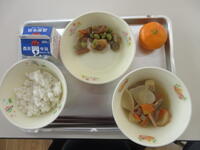 給食のメニューは、びりんめし、牛乳、白玉汁、大豆と豆腐の変わり焼き、れんこんといんげんの和え物でした。今日の「ふるさとくまさんデー」は、宇土地域の紹介で、三角町の戸馳島の郷土料理で、肉のかわりに豆腐がたくさん入った混ぜご飯の「びりんめし」でした。
