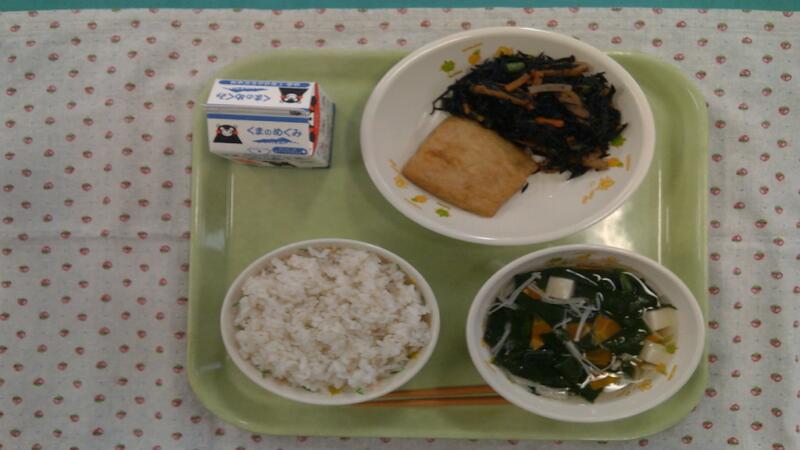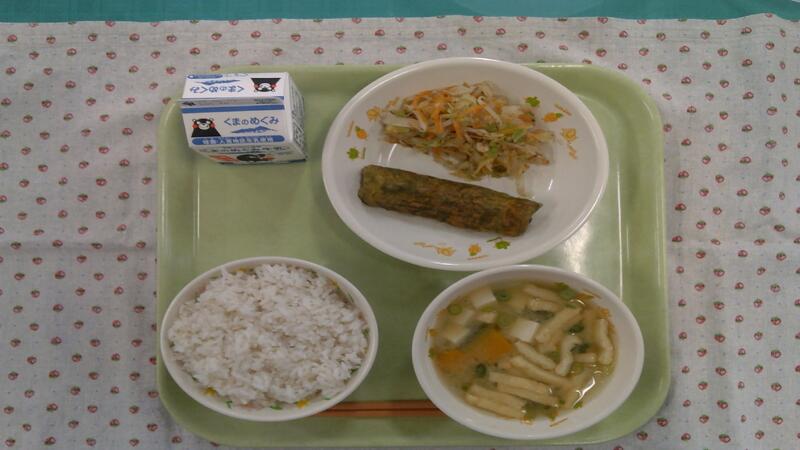 今日は【ふるさとくまさんデー】です。献立は、麦ごはん、牛乳、太刀魚フライ、トマトだご汁、ブロッコリーの昆布和えでした。